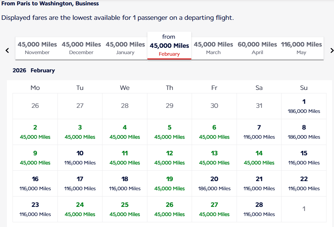On the first weekday of every month, Air France/KLM will update their monthly promos, where award flights are discounted up to 25% off base saver rates. This month’s promos highlight a bunch of economy options between North America and Europe for 18.75k points each way (usually 25k)and also premium economy between Boston and Europe for 30k points (usually 40k). However, an unannounced promo includes IAD to Europe for 45k points in business class (usually 60k). Flights are on Air France or KLM and you can book directly to Amsterdam or Paris, or choose to connect through those cities and have another European city be your final stop.