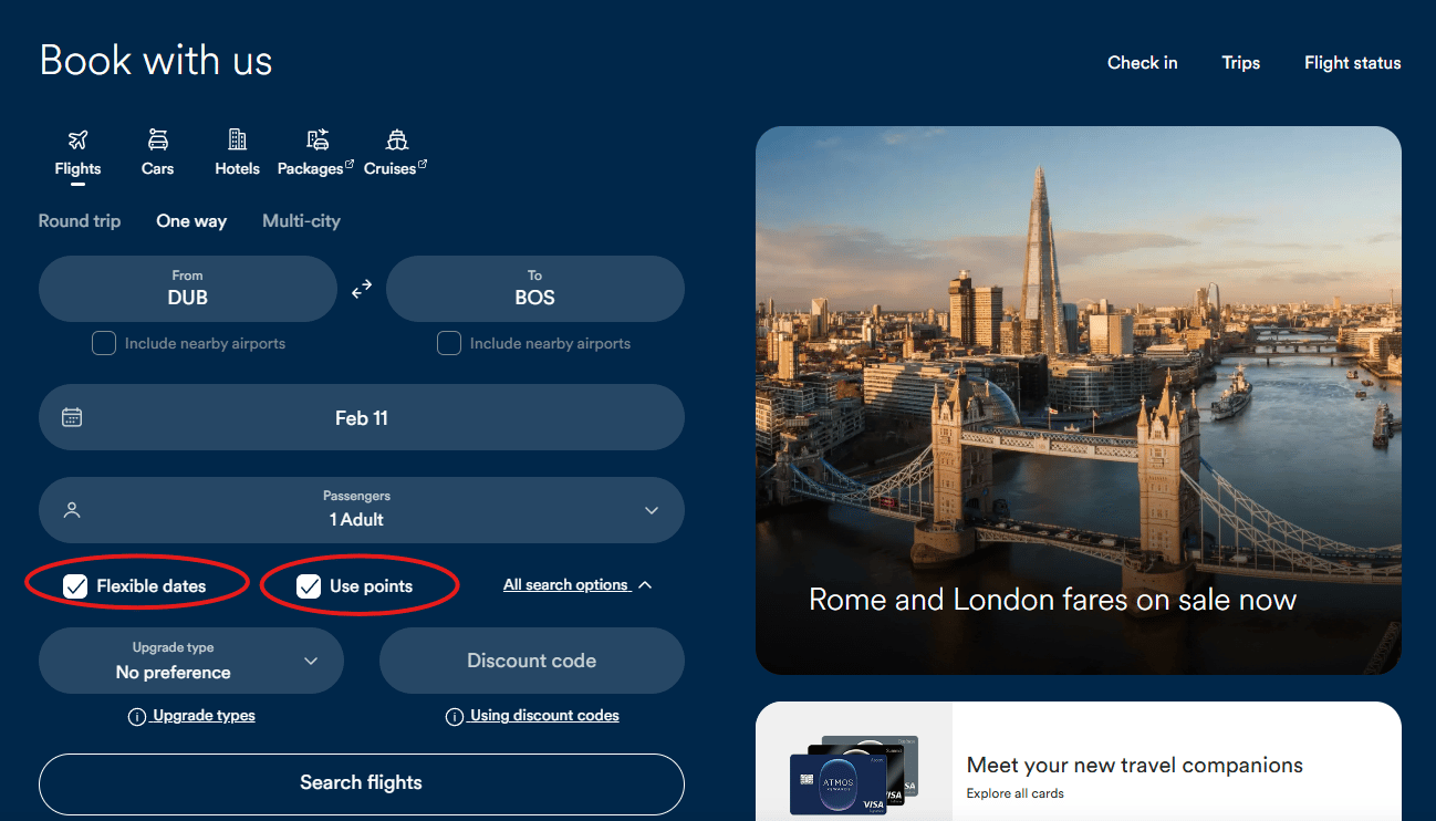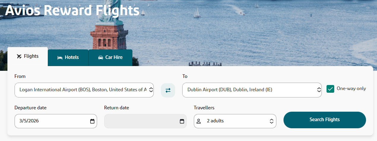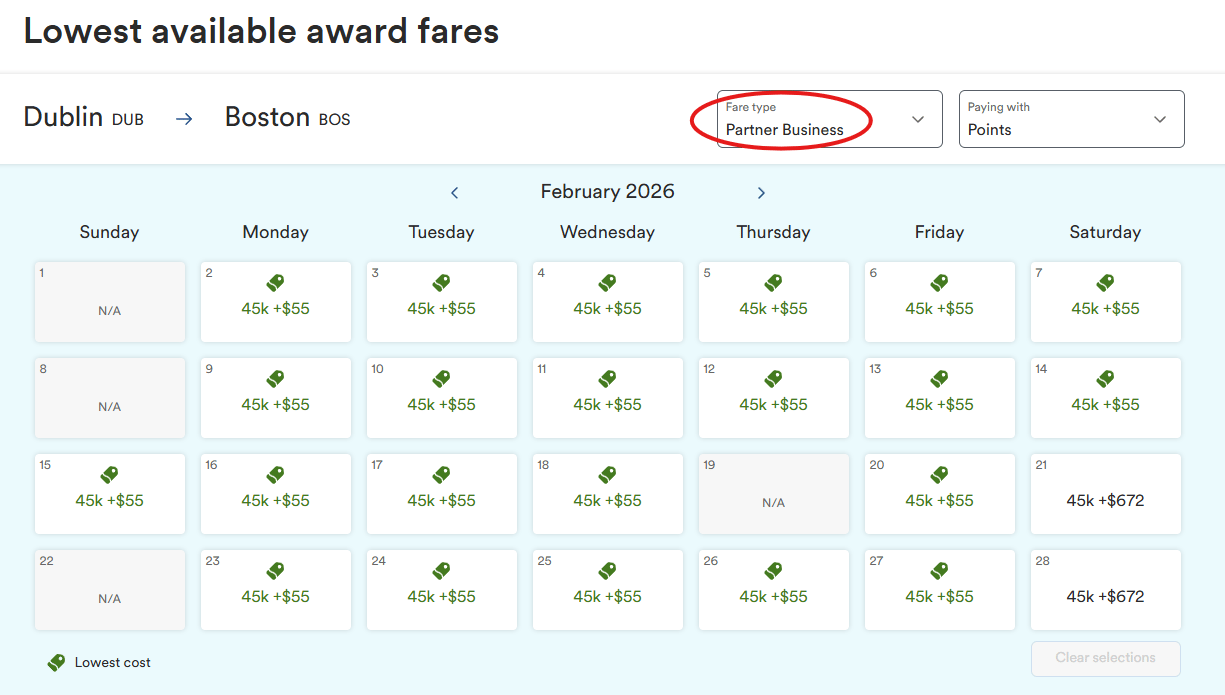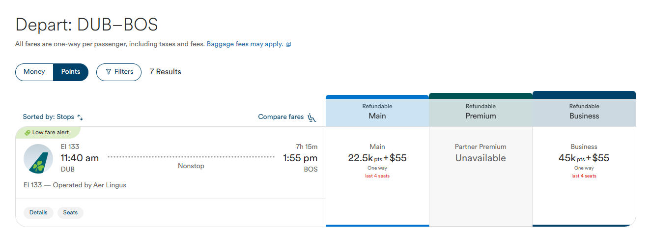 4) Find the dates that work for you and book. Don’t forget, Aer Lingus uses Avios which can be freely transferred across other Avios programs such as British Airways, Qatar Airways, Iberia, or Finnair. Although all these programs use Avios, they all charge a different amount with Aer Lingus having the best pricing.