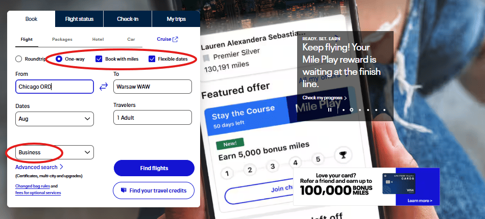 2) For United, put in destination, # of passengers, flexible dates, business class, then click on “Find flights”.