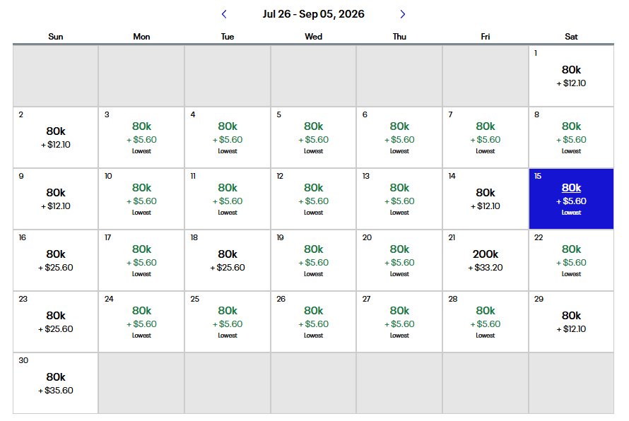 3) After searching, the calendar view should appear. Find dates with the 80k or 88k awards cost as those are saver awards. (80k if you have United status or if you have a United credit card).