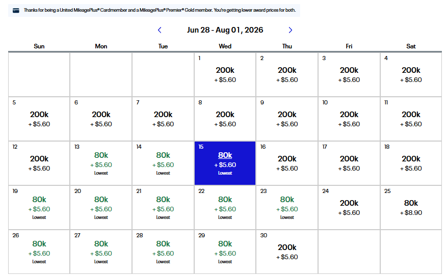 3) After searching, the calendar view should appear. Find dates with the 80k or 88k awards cost as those are saver awards. (80k if you have United status or if you have a United credit card).