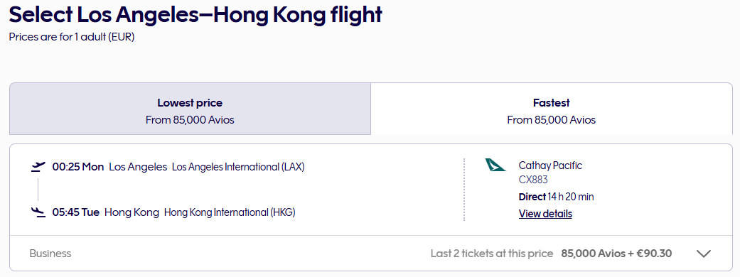 Don’t just limit yourself to Hong Kong, if using Finnair Avios, you can also fly to Taipei with a connection in HKG also for 85k Avios (other cities usually don’t show up on Finnair though but test it to be sure). You could also fly to/from LAX and most of Asia for 88-115k points one way when booking directly with Cathay and to/from ORD for 115k. This includes Singapore, Manila, Bangkok, Hanoi, Beijing, and Shanghai among many others!