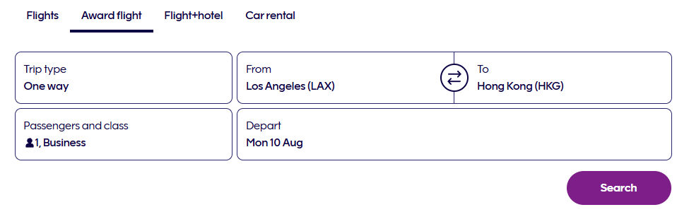 2) Once logged in, choose the “Award flight” option, put in destinations, and choose business class and put in a specific date. Then hit search.