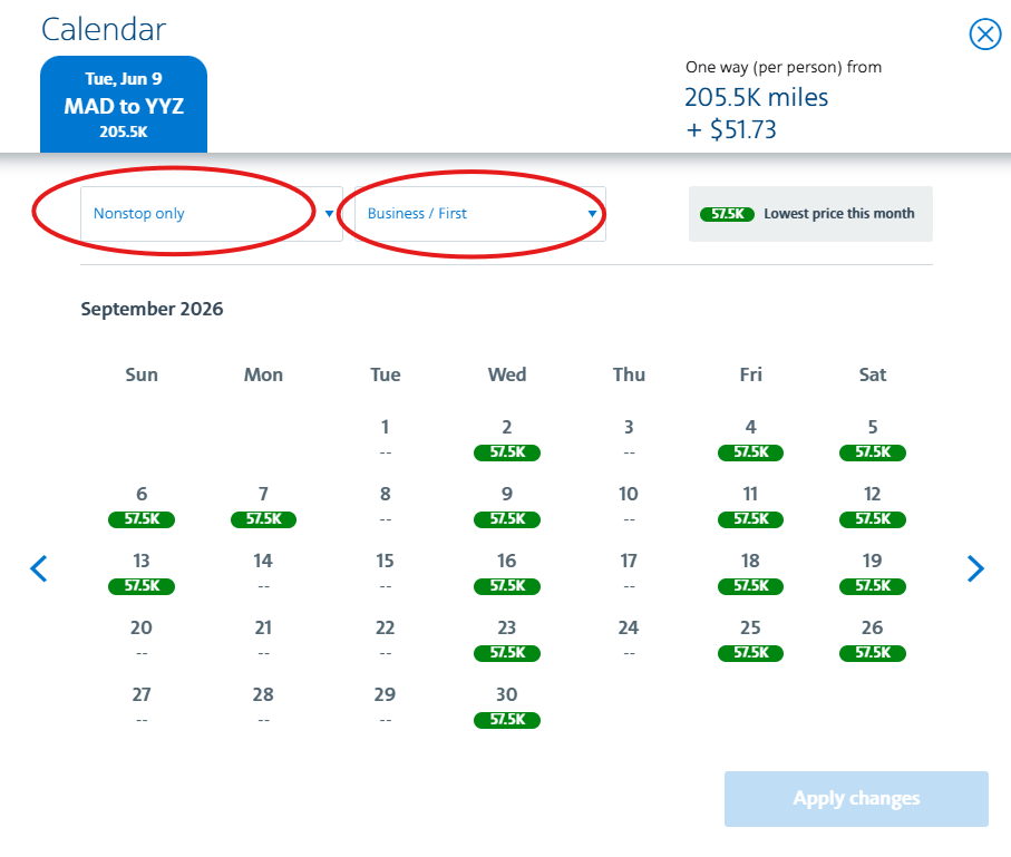 1) On the AA site, input destinations (YYZ/MAD) and choose “Redeem miles”. Keep the number of passengers at 1 since AA is only getting 1 seat (BA/IB should have 2+). Search a date between June-October 2026. Also search one-way.
