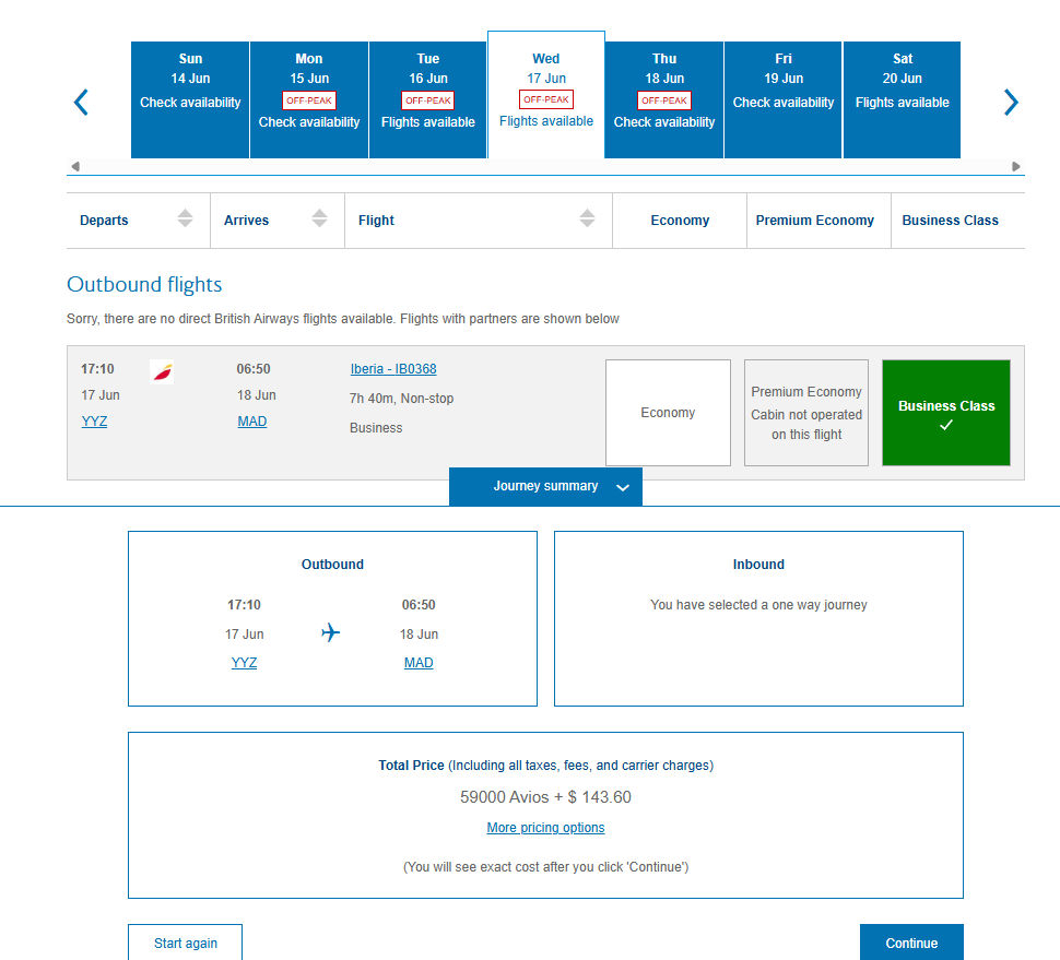 3) Once you find the dates that work with your schedule, search the flight again on BA/IB’s own site and verify there is availability. Then transfer and book!