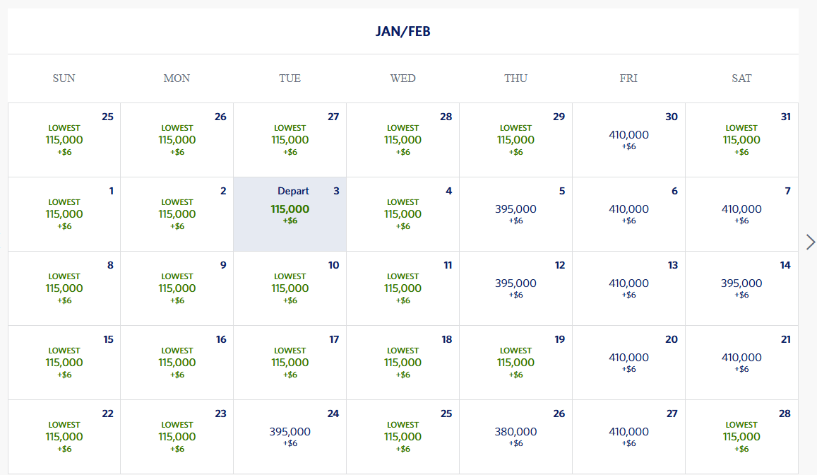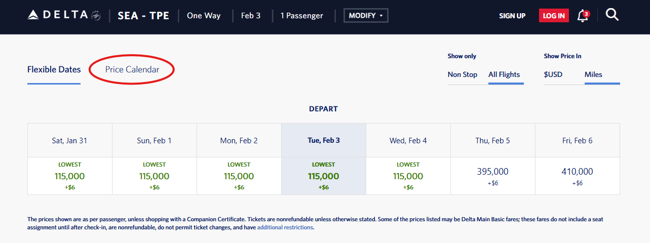4) Use the calendar view to quickly find dates with availability. The lowest-cost option between SEA/TPE is 115k points before any Delta cardholder discount.