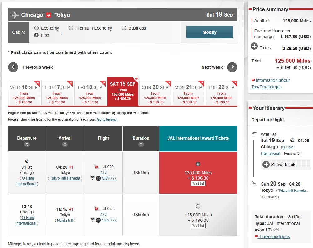However, I noticed that the first class award flights I found are generally only bookable with partners such as British Airways, Cathay Pacific, and Qantas. Most days that I found availability are not bookable on JAL’s own program.