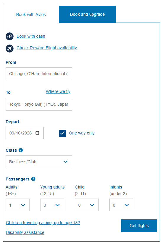 3) On the search screen, input your dates, destinations, choose “One way only”, and choose either business/club or first class as your preferred cabin. Then hit “Get flights” to search.