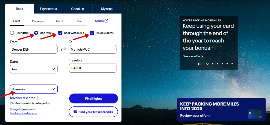 2) For United, put in destination, # of passengers, flexible dates, business class, then click on “Find flights”.