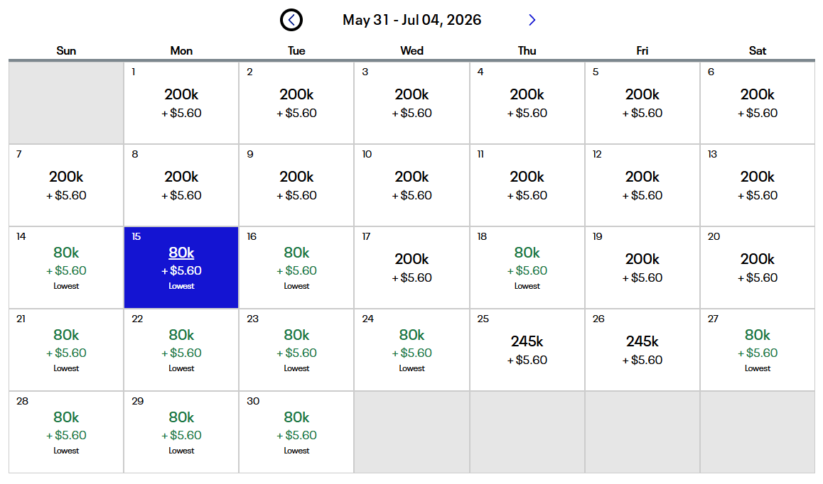 3) After searching, the calendar view should appear. Find dates with the 80k cost as those are saver awards.