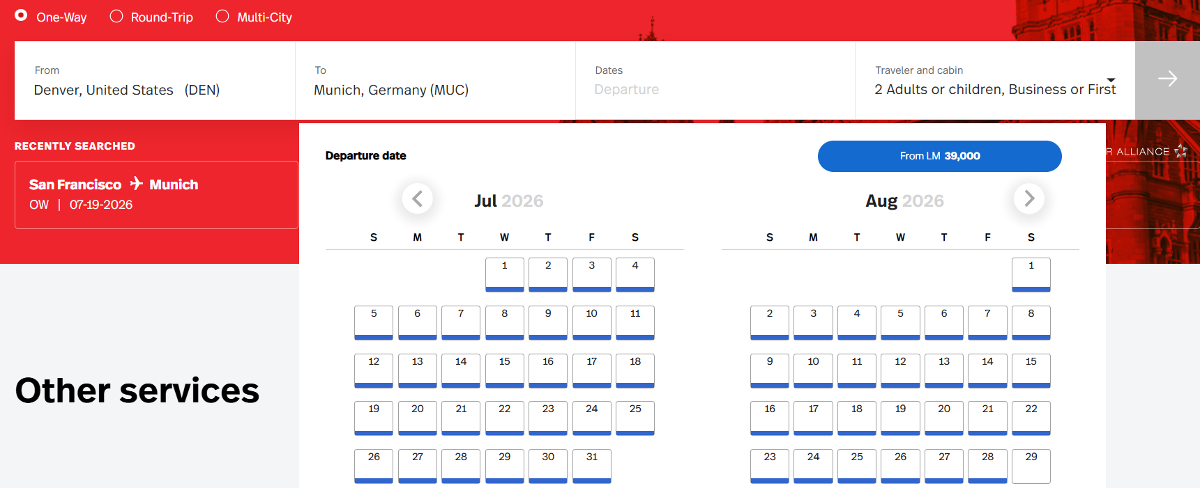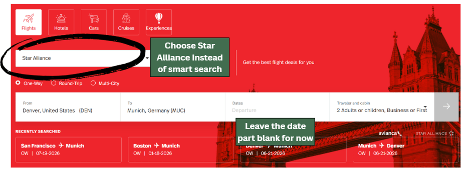 1) After logging in, you’ll want to choose a “Star Alliance” search, search for one-way, choose business class, and put in destination details. Don’t choose a date yet.