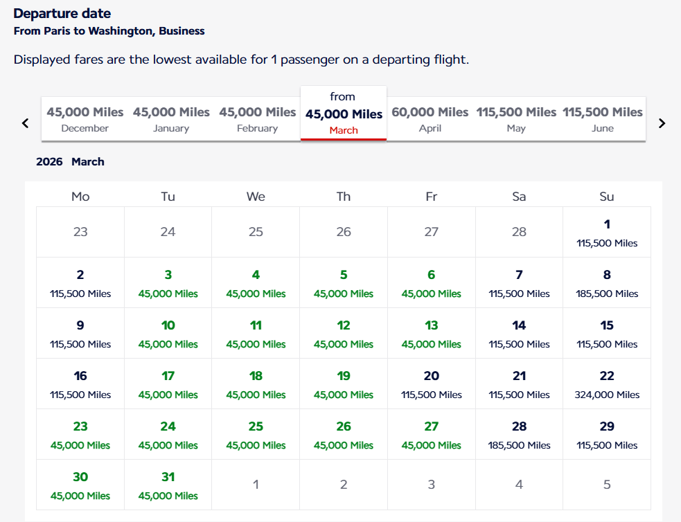 Book Air France or KLM business class for as low as 45k points one way from Europe to IAD. With the 20% AMEX transfer bonus to AF/KLM, you’ll only need 38k points. Most availability is now from Europe back to the US with only a handful of dates available to Europe.